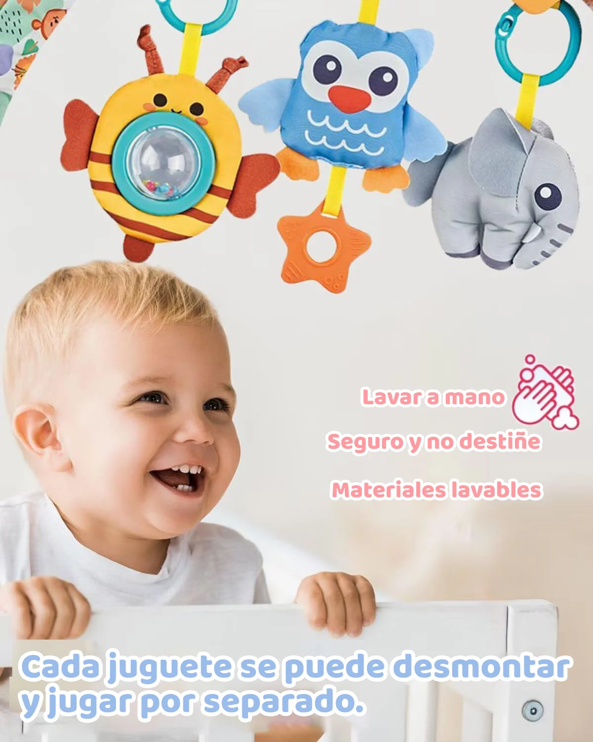 Cada pieza puede retirarse y colgarse en cochecitos, cunas o gimnasios de actividades, fomentando la coordinación ojo–mano y el agarre.