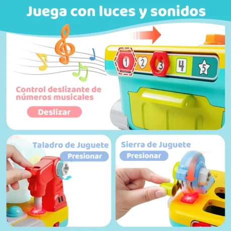 Incluye una completa variedad de herramientas como taladro eléctrico de juguete, motosierra, martillo, destornillador, llave, engranajes, tornillos y más, además de divertidas actividades como juego de pelota, deslizador de números y canciones que mantienen a tu peque entretenido por horas. Todas las piezas pueden guardarse fácilmente en su práctico cajón integrado.