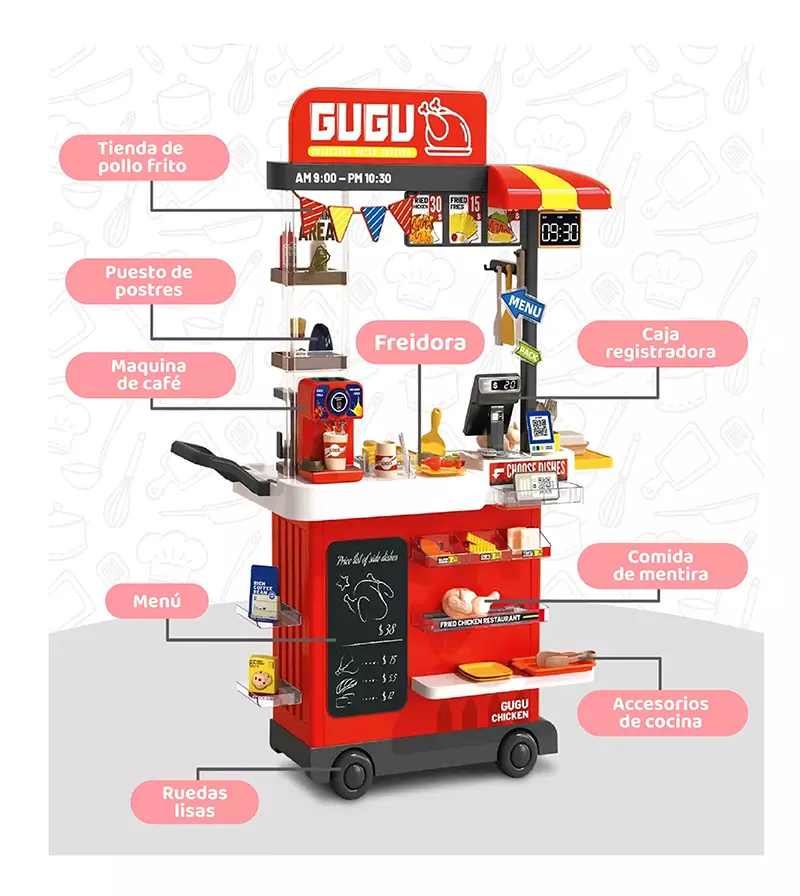 El Carrito Sanguchero Infantil GUGU está diseñado para que los niños vivan la emoción de tener su propio puesto de comida rápida, estimulando la imaginación, la creatividad y el juego de roles desde temprana edad.