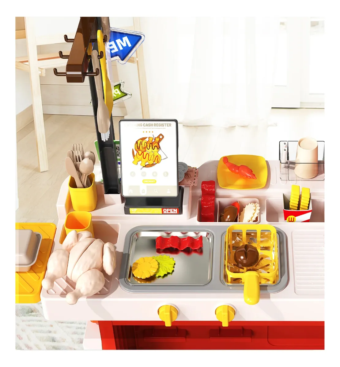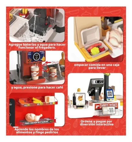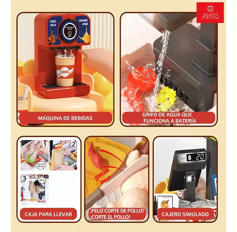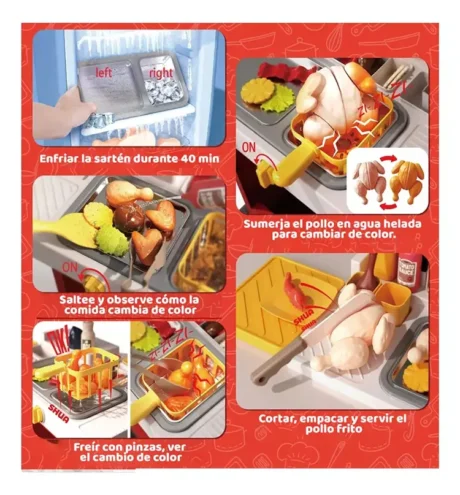Con una altura de 102 cm y 82 piezas, este carrito ofrece una experiencia completa de cocina interactiva, con sonidos, vapor, agua real y alimentos que cambian de color, haciendo que cada juego sea único y sorprendente.