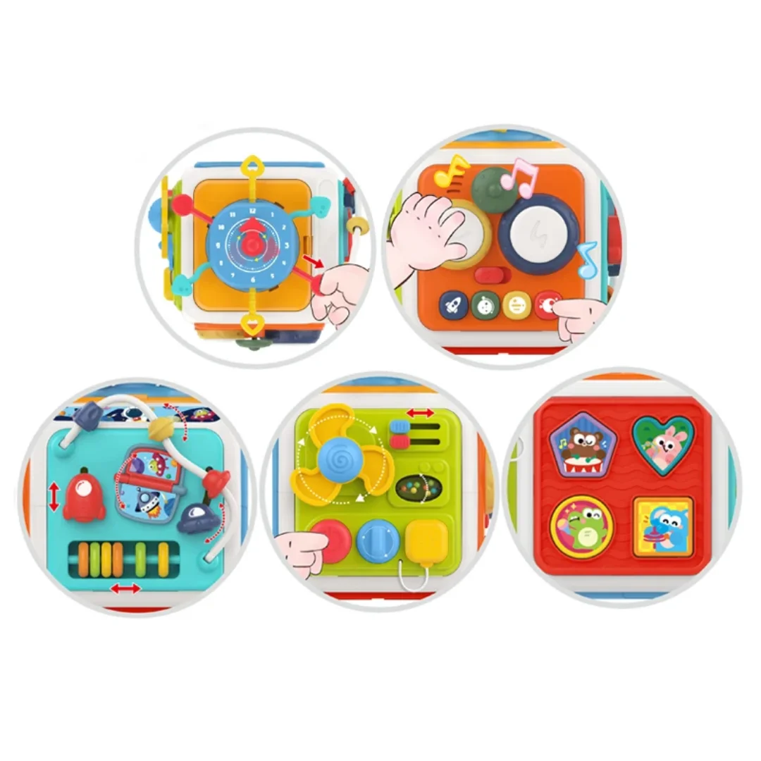 Cada una de sus caras ofrece una nueva aventura: laberintos de fichas, clasificadores de formas, engranajes giratorios, botones con sonidos y luces, y piezas deslizables que invitan al bebé a explorar, tocar y descubrir.