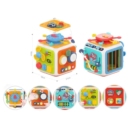 Este cubo didáctico estimula la motricidad fina, la coordinación mano-ojo, el desarrollo sensorial, la lógica temprana y la comprensión de causa y efecto. Ideal para mantener a los pequeños entretenidos mientras aprenden.