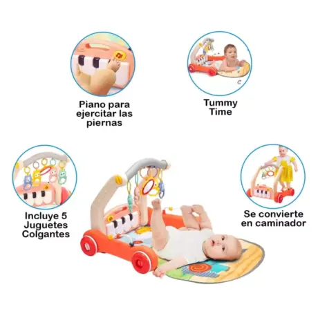 Gimnasio y caminador 2 en 1 es el juguete perfecto para acompañar a tu bebé desde su nacimiento. Este correpasillos está diseñado con una diadema de colgantes coloridos en forma de animales, un espejo y ruedas deslizantes que contribuyen al desarrollo sensorial de tu pequeño. Además, cuenta con un piano musical que ofrece melodías agradables, haciendo que la diversión sea educativa y amena.