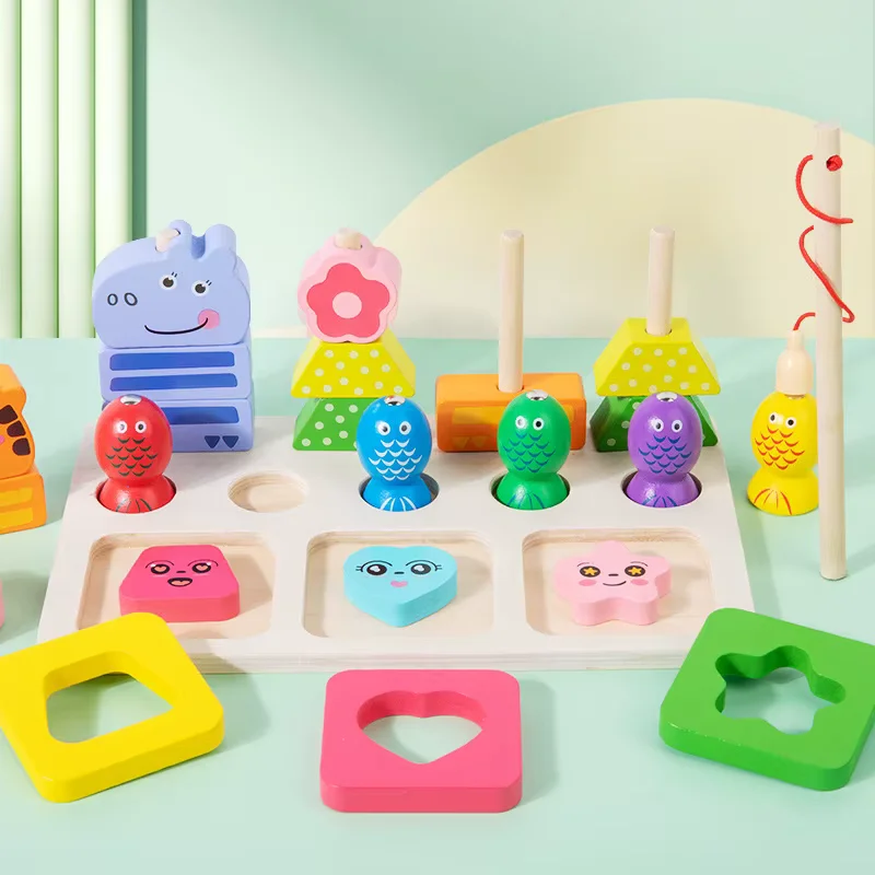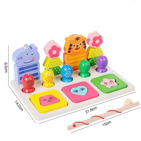 Este tablero apilable y de pesca 3 en 1 combina tres actividades clásicas en un solo juego: pesca magnética, encaje de formas y apilado de piezas.