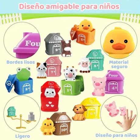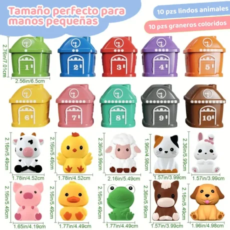 Un set Montessori lleno de diversión y aprendizaje que incluye 20 piezas: 10 animalitos adorables y 10 casitas de colores. ¡Los peques se enamorarán de sus nuevos amigos de la granja!