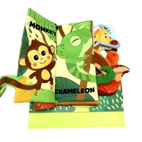 Este encantador libro de tela musical está diseñado especialmente para estimular los sentidos y el desarrollo temprano de tu bebé mientras se divierte explorando la selva.