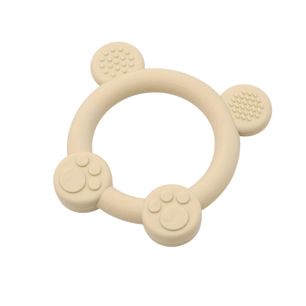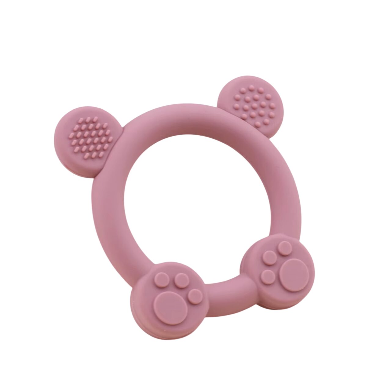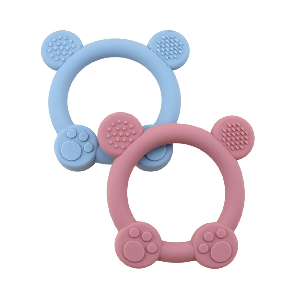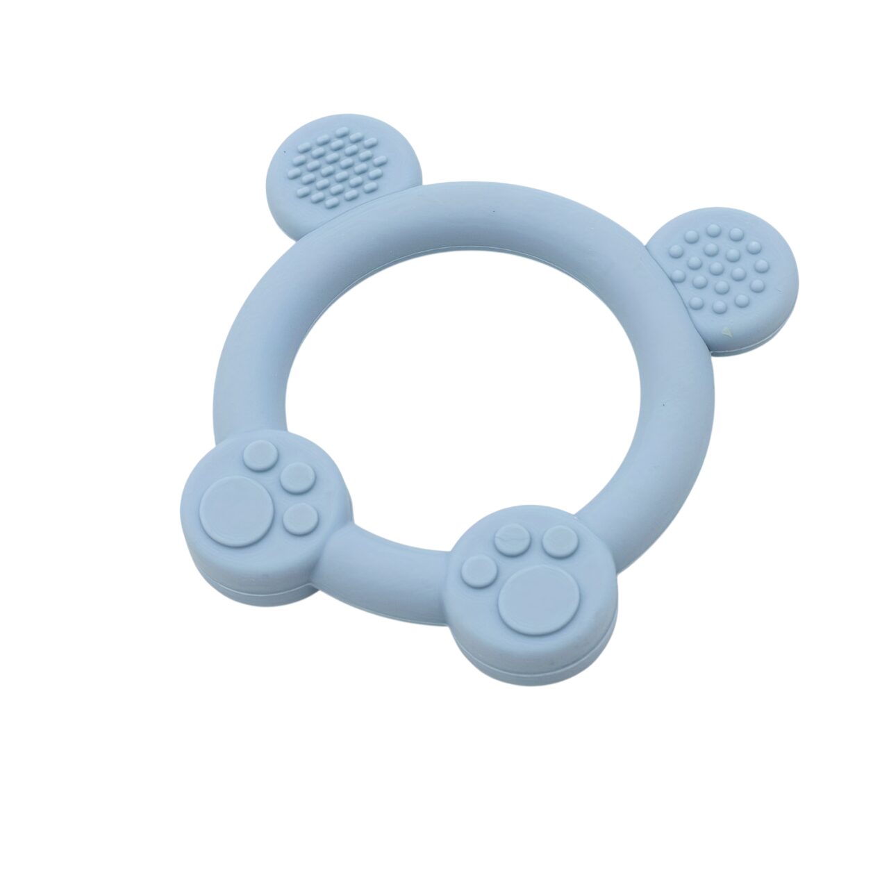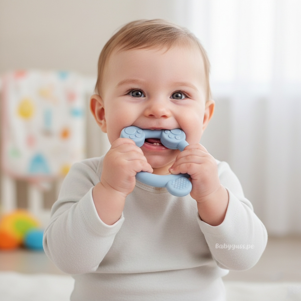 Mordedor de silicona hecho de material suave ideal para calmar el dolor de las encías a causa de la salida de los primeros dientes del bebé.