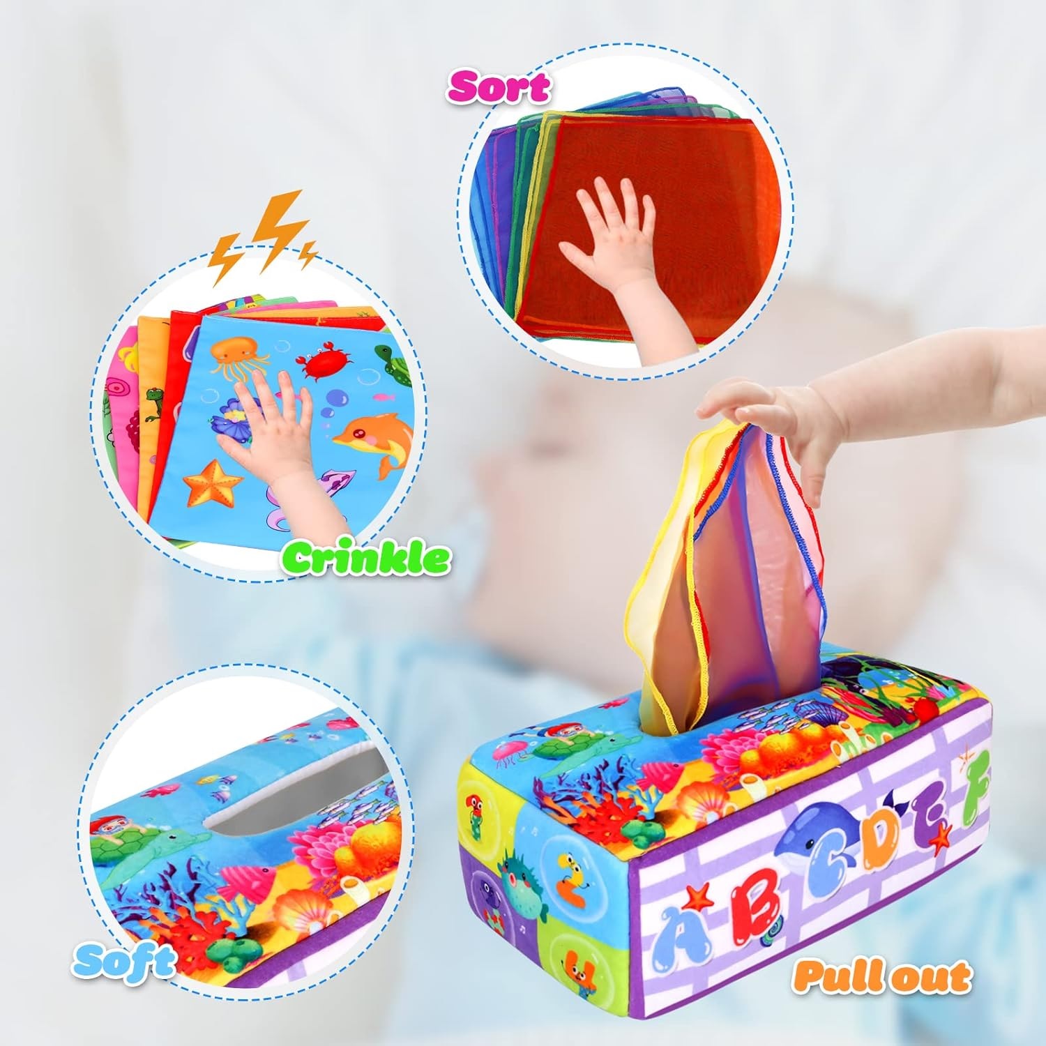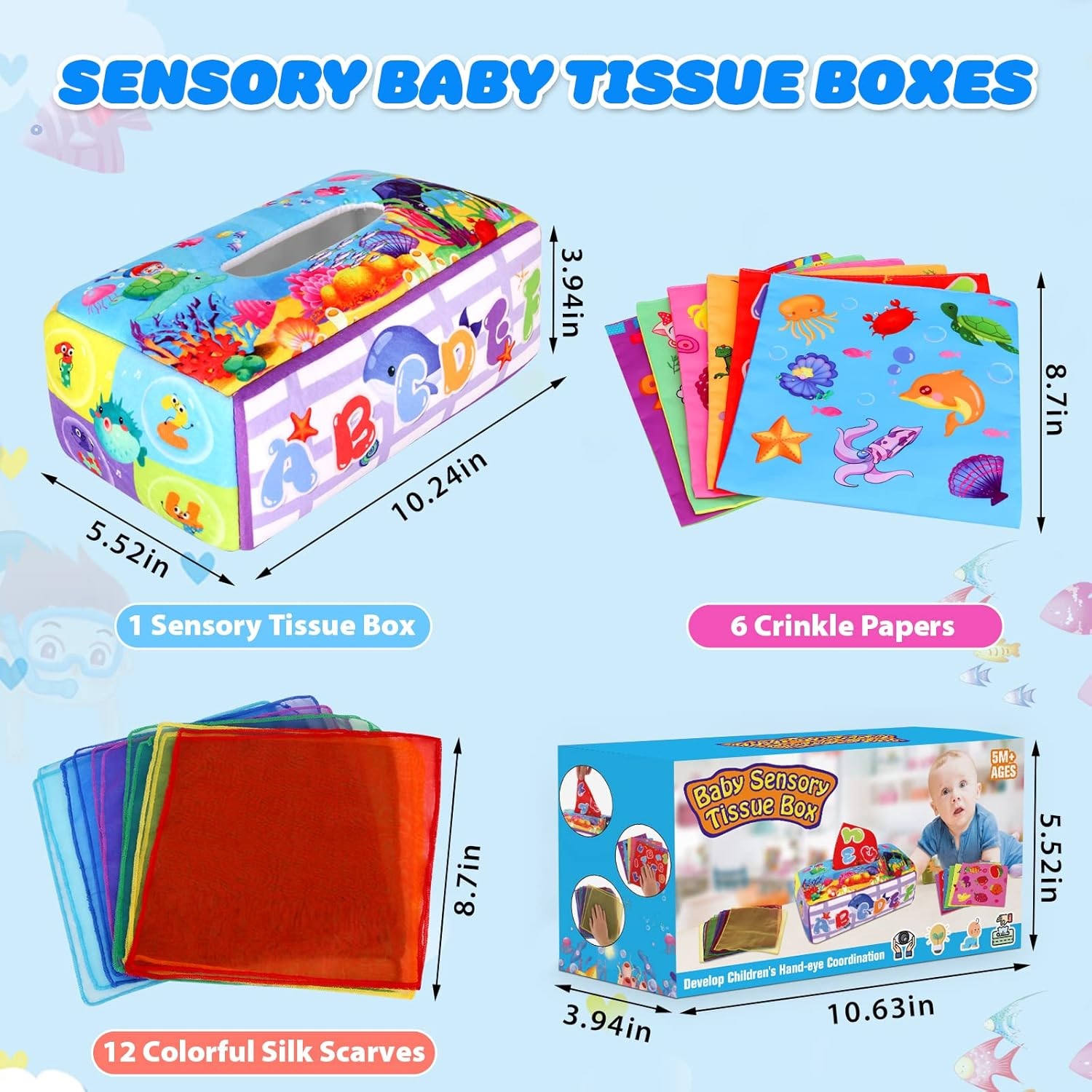 Estimula los sentidos y el desarrollo temprano de tu bebé con esta caja de pañuelos sensorial Montessori, diseñada para ofrecer horas de diversión segura y aprendizaje interactivo.