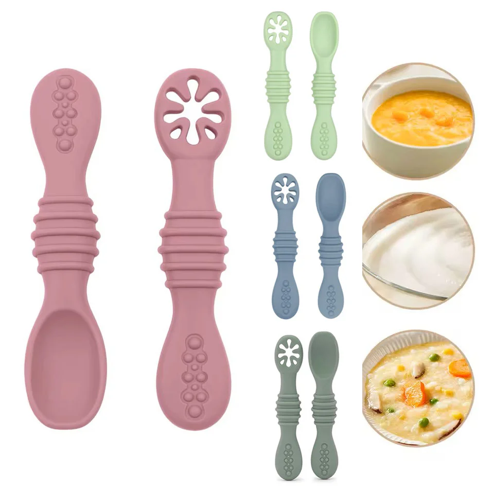 Pack de 2 cucharas formado por 1 cuchara aprendizaje (primera etapa), diseñada para comer los primeros alimentos sólidos, como purés, yogures de una manera rápida y segura, y una segunda cuchara fabricada en silicona suave para no dañar las encías del bebé. Ambas cucharas tienen un diseño ergonómico facilitando el agarre, siendo el mango del tamaño adecuado a la mano del bebé. Estas cucharas están recomendadas por nutricionistas infantiles y expertos en BLW.
