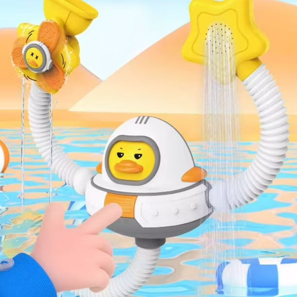 Convierte la hora del baño en un momento lleno de risas con esta adorable regadera automática en forma de patito astronauta Solo debes fijar la ventosa a la bañera, colocar la bomba en el agua y presionar el botón en forma de estrella 🌟 — ¡el agua comenzará a fluir como una ducha real!