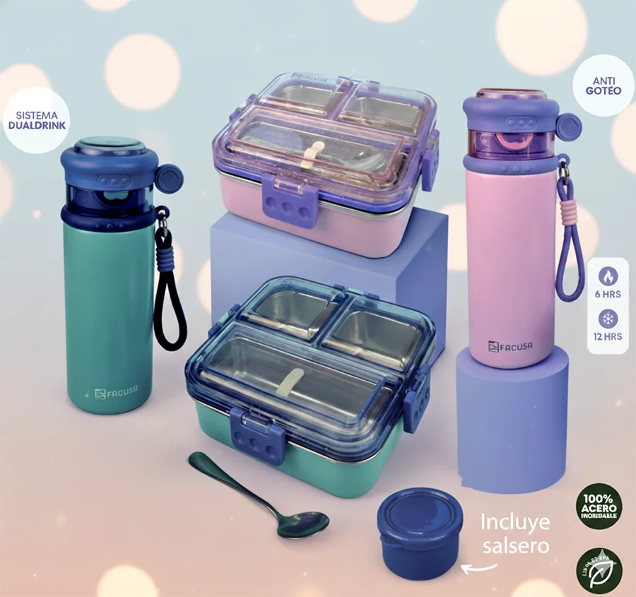 Elementos incluidos: 1 lonchera con 3 divisiones de acero , 1 cuchara