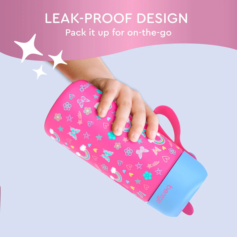 Mantén la bebida de tu hijo fresca durante 12 horas con esta botella de agua de acero inoxidable aislada. El acero inoxidable 18/8 de primera calidad y el aislamiento al vacío de doble pared mantienen las bebidas frías durante más tiempo.