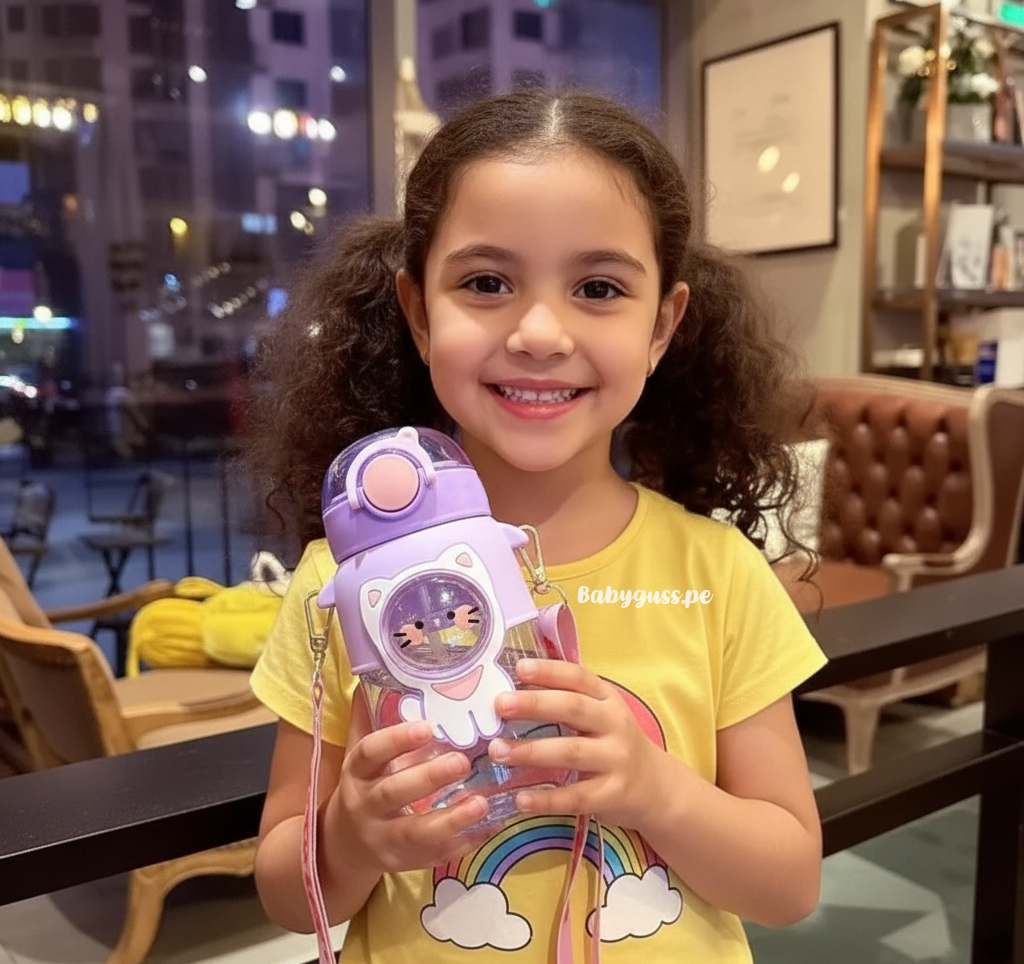 Su cubierta protectora ayuda a amortiguar golpes y evita deslizamientos, mientras que el sujetador tipo carterita permite llevarlo cómodamente colgado o en la mochila. Cuenta con botón de fácil apertura, pensado para manitos pequeñas, y un cierre seguro que evita derrames.